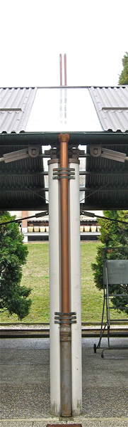 I moduli sviluppati su di una forma a spirale a quattro facciate sono realizzati con struttura in cemento armato, interamente rivestiti in grandi lastre di marmo travertino lucidato, allineati e protetti da leggera copertura in carpenteria metallica a vista.